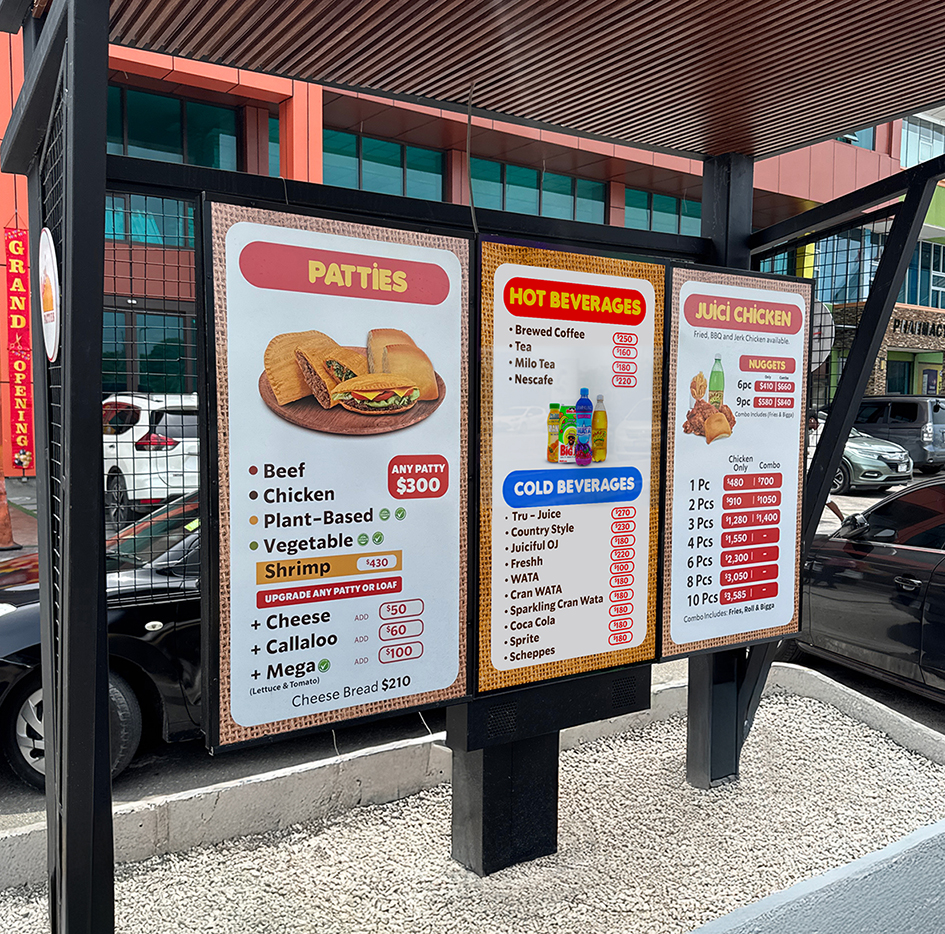 The franchise owners contacted Main Event Entertainment Group Ltd, a full-service production company, in August 2024. As a regular, trusted supplier of indoor digital signage solutions for three other Juici Patties franchises in the parishes of St. Ann (Discovery Bay) and St. James (Ironshore & Harbour City Shopping Mall, Montego Bay) through its Digital Signage division, Main Event was the first-choice partner for digital signage at Drax Hall, St. Ann branch. The owners wanted dynamic indoor menu boards as well as an outdoor digital menu board for the drive-thru – a first for the Juici Patties chain. Its location is ideal, benefiting from a high level of passing traffic that helps to attract and engage customers, offering them an alternative drive-thru experience focused on service efficiency.