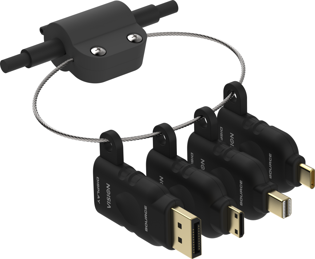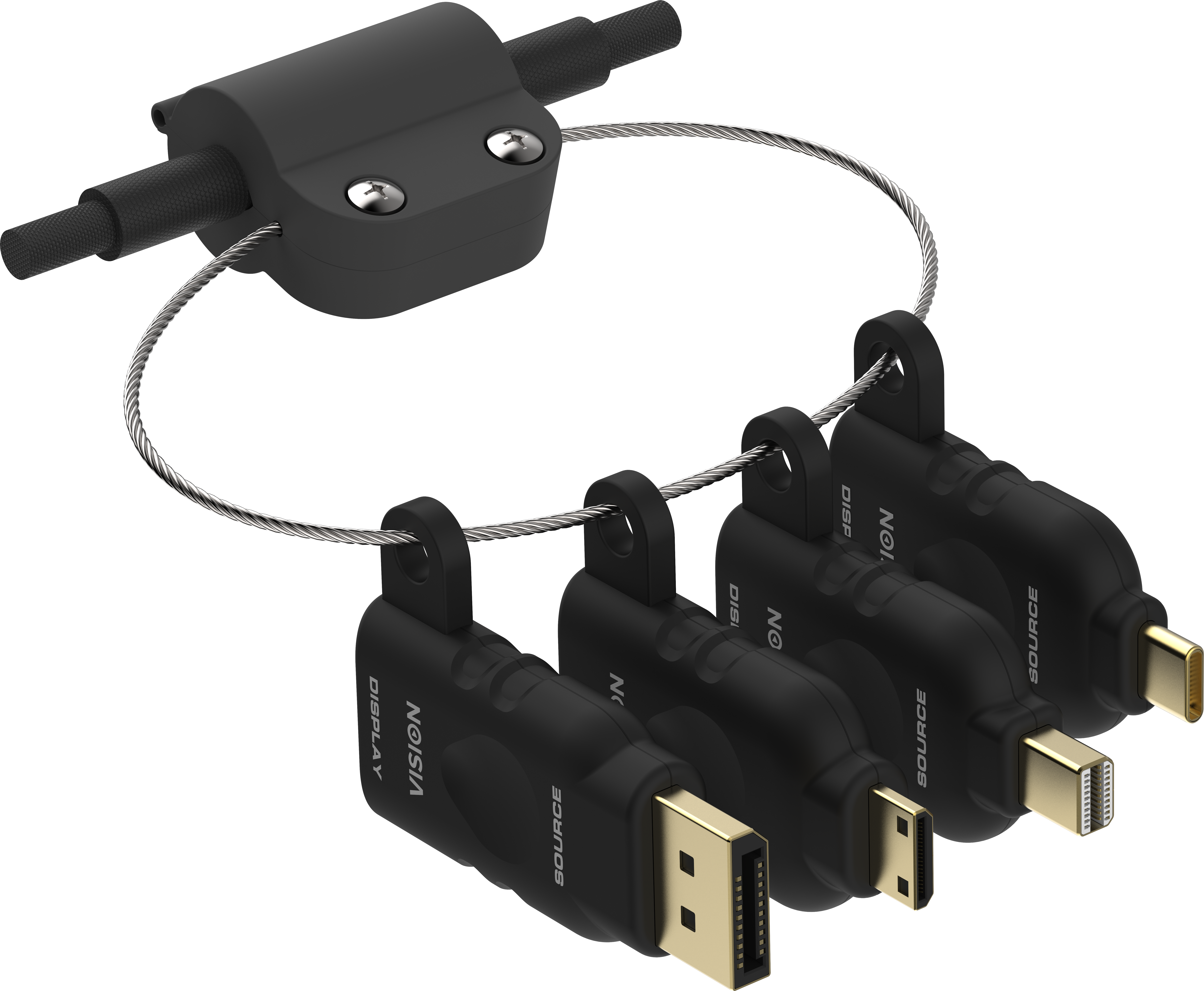 The Multi HDMI Adaptor fixes to HDMI cables of various thicknesses and is tamper-proof. It includes four of the most common video formats: MiniDisplayPort, DisplayPort, Mini-HDMI and USB-C, which has been tested and is compliant with the latest Microsoft Surface Pro 7.
